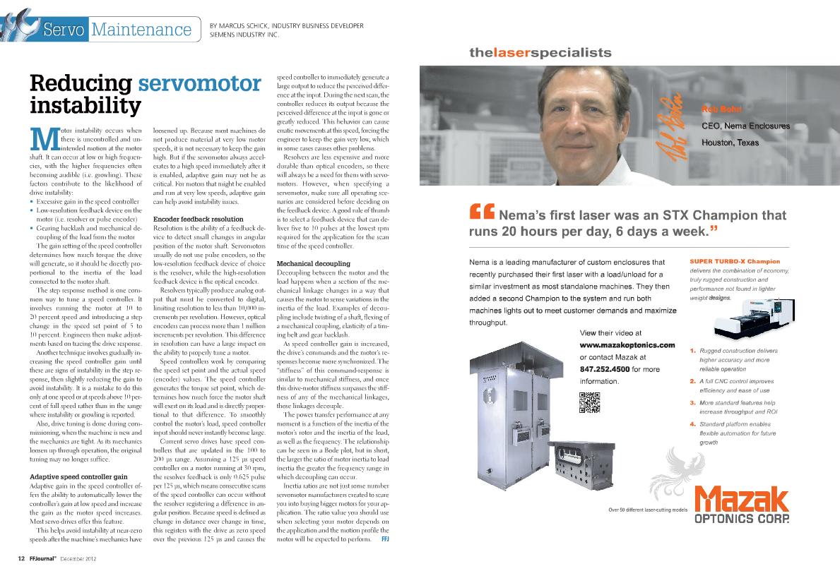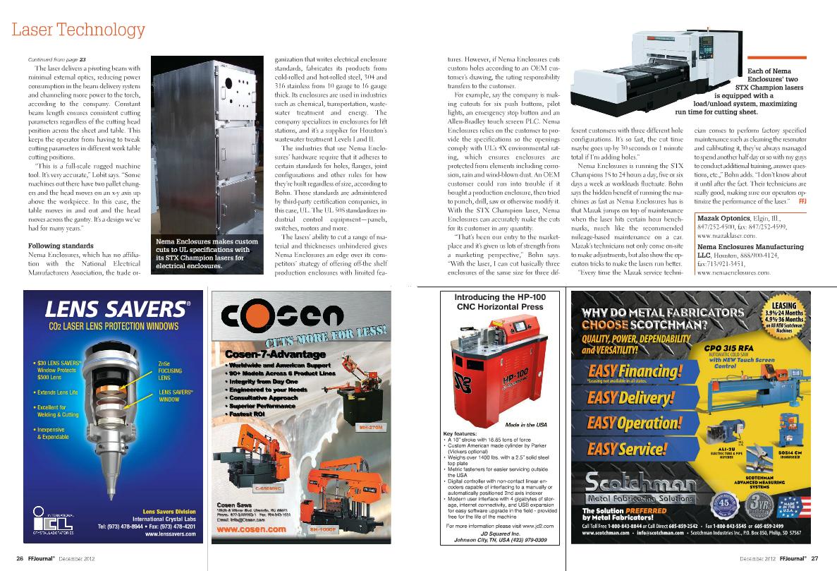 Rob Bohn and Nema Enclosures were featured in the December 2012 of the FFjournal. Check out the article on how Nema Enclosures uses the latest Mazak laser technology to successfully manufacture high quality custom electrical enclosures and the Mazak Optonics Corporation testimonial advertisement below. Click on the FFjournal cover to read the story on the online edition of the magazine.